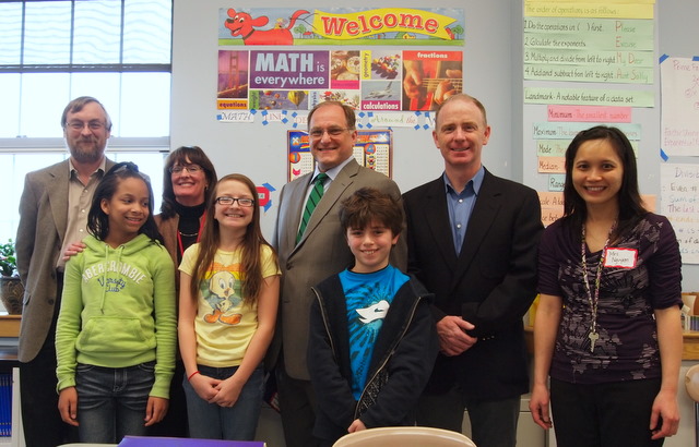 - L to R: School Committee Chair Glenn Pavlicek, Principal Marcia Uretsky, Congressman Capuano, School Committee member Denis Keohane,5th Gr Teacher Thuy Nguyen and Tucker 5th Graders