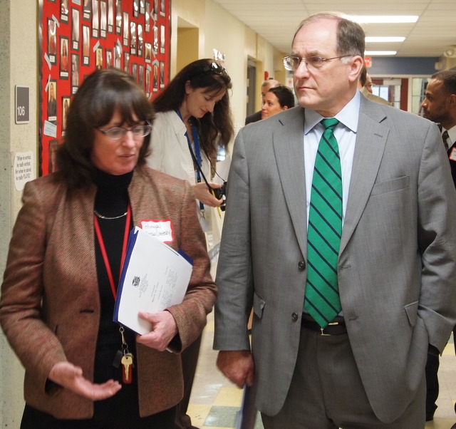 Superintendent Gormley, school officials, and committee members gave Congressman Capuano a tour of Pierce and Tucker. At Tucker, Principal Marcia Uretsky walked the congressman through a typical day at Tucker. They looked in on classes, observed a guest dance performance, and met with teachers.