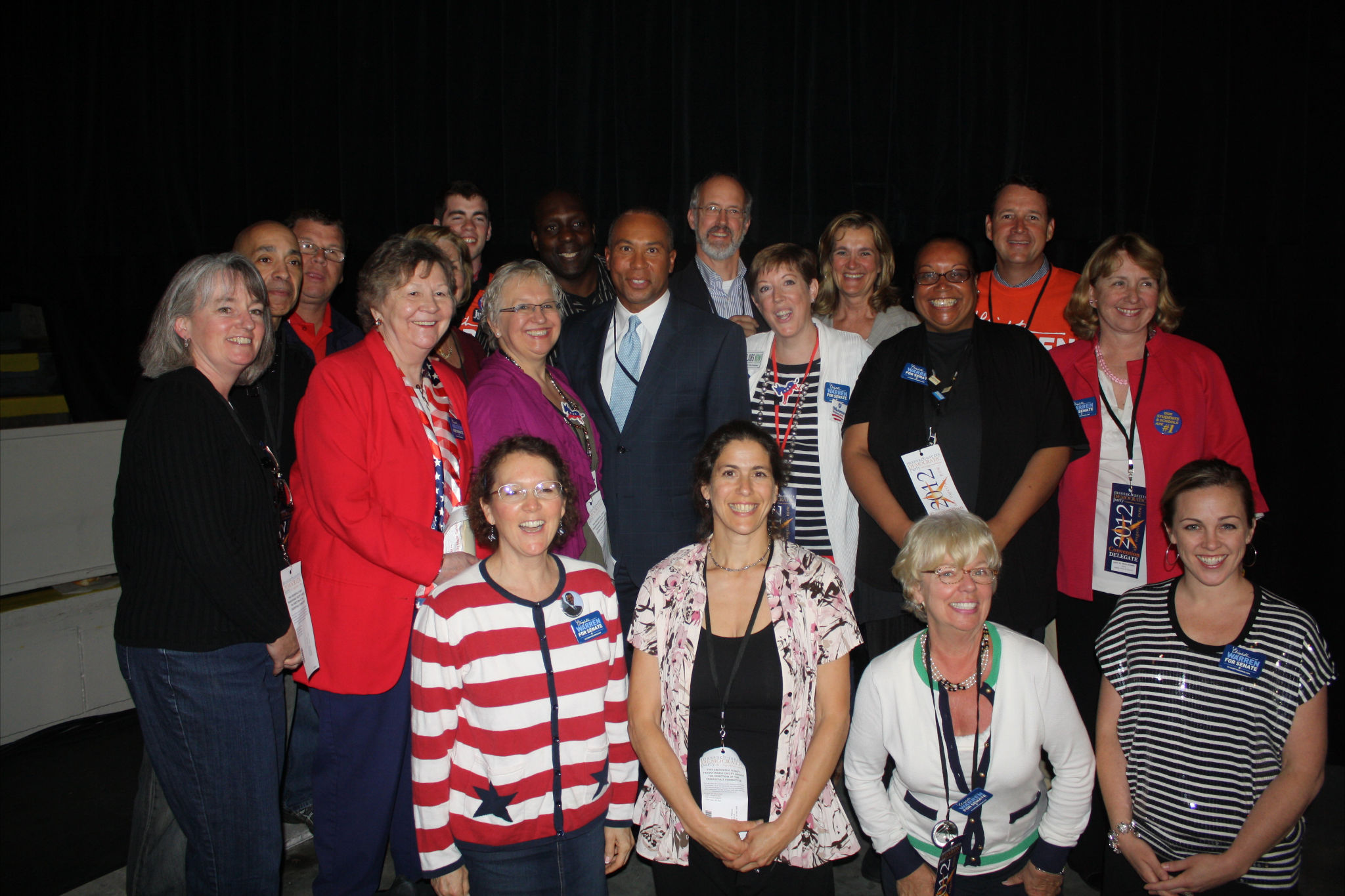 First Row: Laurie MacIntosh, Deborah Milbauer, Catherine Shaffer, April Lamoureux Second Row: Germaine Riordan, Pat Armstrong, Joan Gancarski, Governor Deval Patrick, Kathryn Fagan, Lovie Elam, Judy White-Orlando Back Row: Bill Moran, Thomas Flynn, Kathleen Moore, Michael Joyce, Darnell Turner, Michael Maholchic, Kristine Hodlin, Bill White