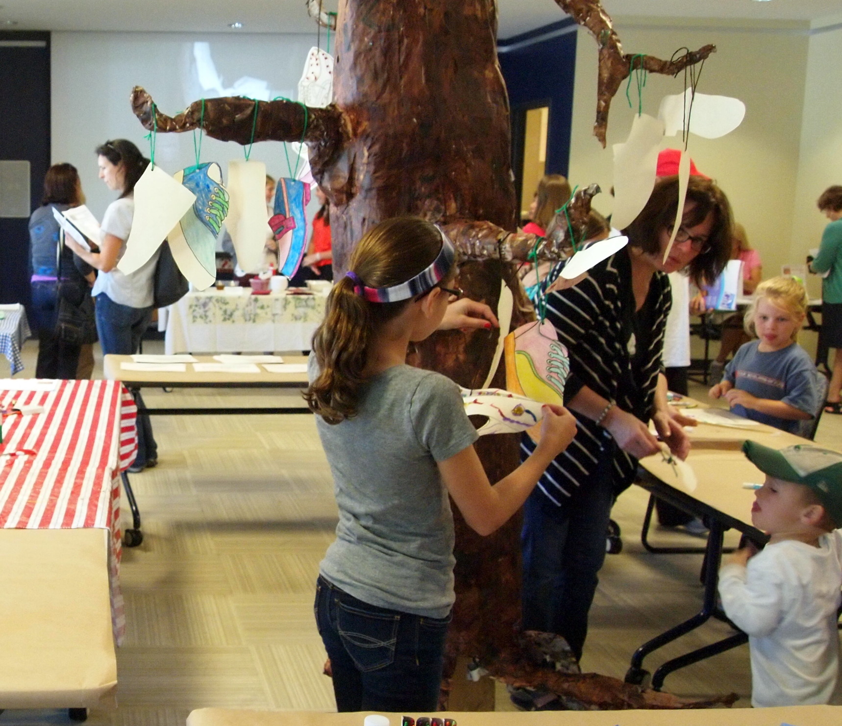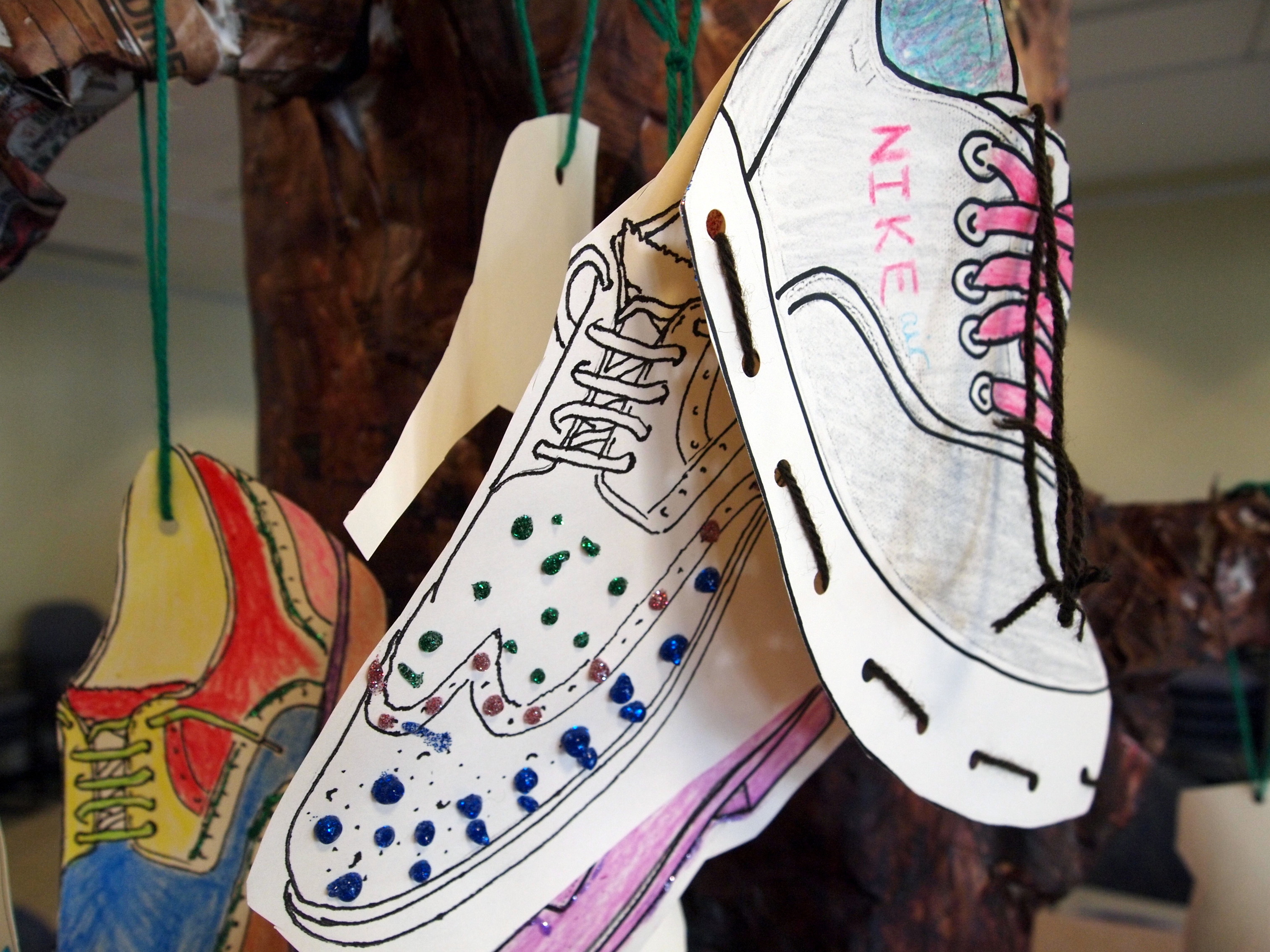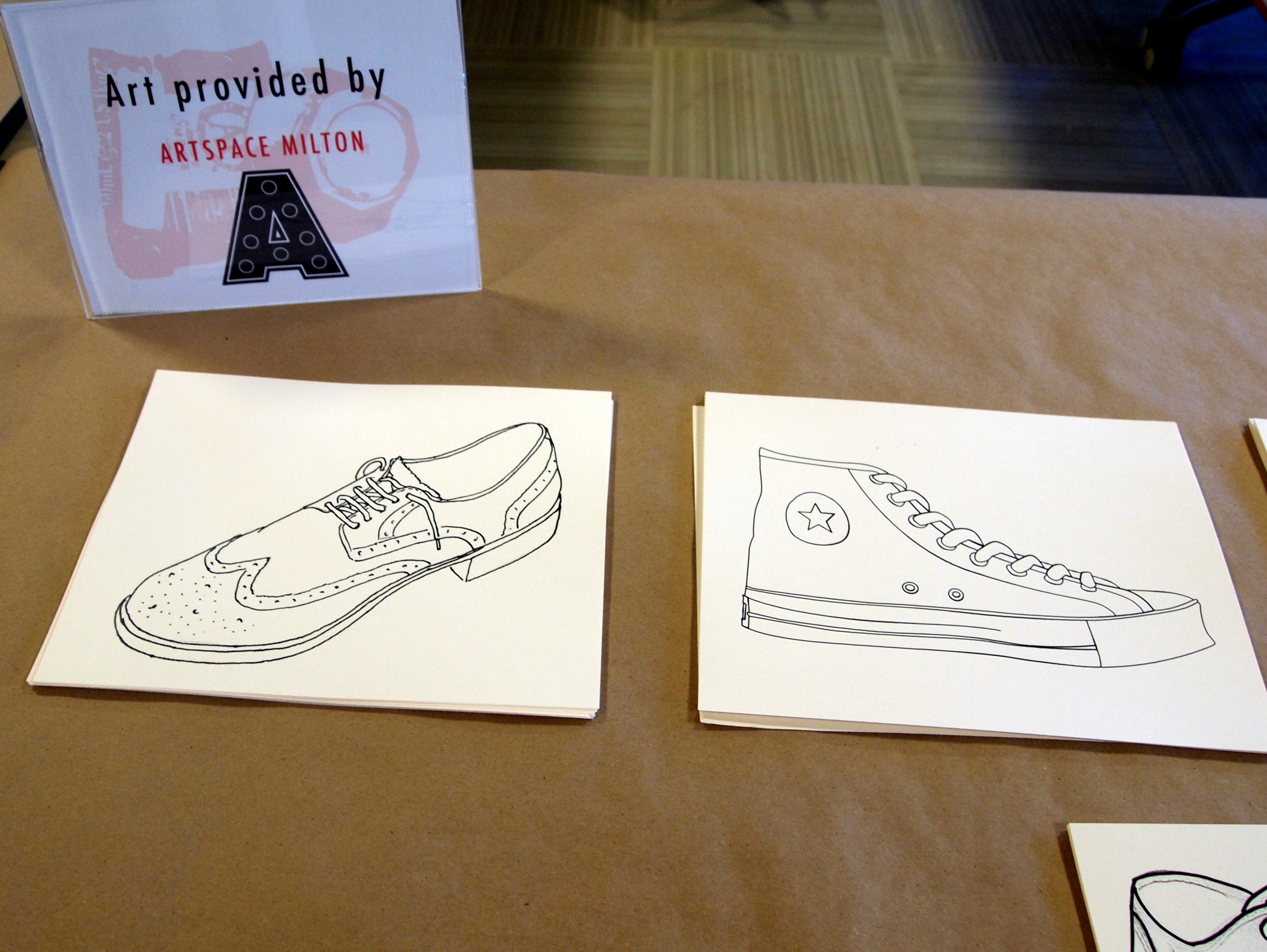 The Milton Reads! 2012 town wide reading initiative kicked off last week end with an Open House. The One Book, One Town program is offering a series of events around the novel To Kill a Mockingbird by Harper Lee. The Friends of the Library served some southern fare, tea and cobbler, and Artspace Milton ran an activity that keyed off a major theme of the book: You cannot understand a man until you have walked around in his shoes.